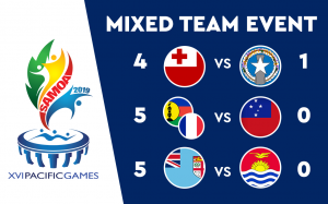 New Caledonia were fast off the blocks to unsettle the first seeds from Tahiti. Johanna Kou and Ronan Ho-Yagues got the first point on the board with an impressive victory in the Mixed Doubles.